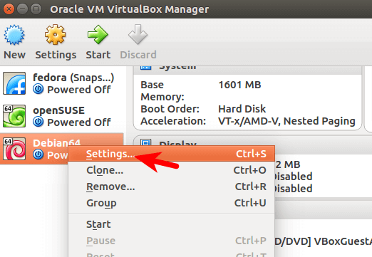 在Virtualbox管理器窗口,右击你的Linux虚拟机,选择设置(settings).