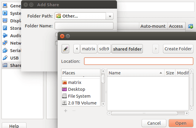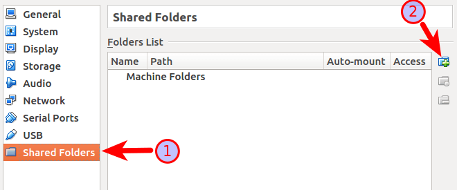在左边的面板中,选择共享文件夹(shared folders).然后点击添加按钮来添加一个共享文件夹.